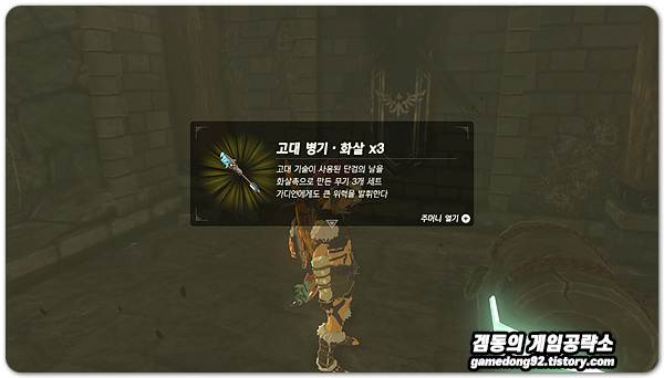 훈련소로 들어왔던 길로 다시 나가면 계단을 오르기 전 허물 수 있는 벽을 발견할 수 있는데, 벽을 허물어 보물상자에서 고대 병기 화살 3발을 파밍 하세요. 앞으로 유용하게 쓰입니다.