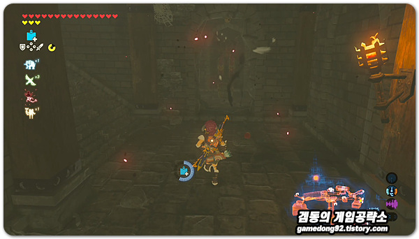 통로로 올라와 반대쪽 갈림길로 들어오면 원념에 가로막혀 들어갈 수가 없는데, 건너편 통로의 천장을 자세히 보면 원념의 눈이 있습니다. 화살로 살포시 터트려주면 길이 열려 통과할 수 있게 됩니다.