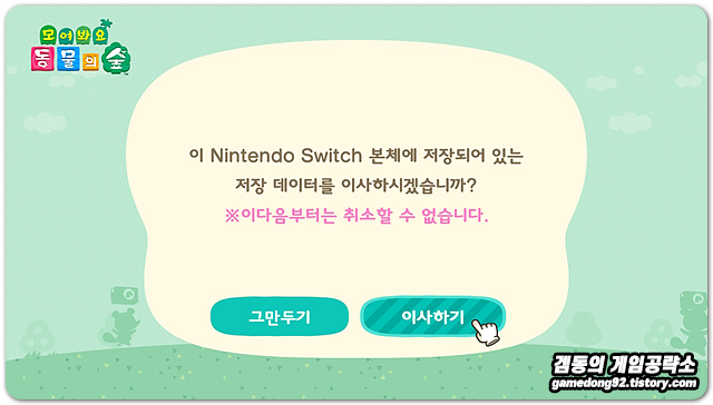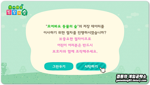 모르고 있었는데 2020년 11월 19일 자로 모여봐요 동물의 숲 섬 이사 서비스 (저장 데이터 옮기기)가 추가되었더라구요!