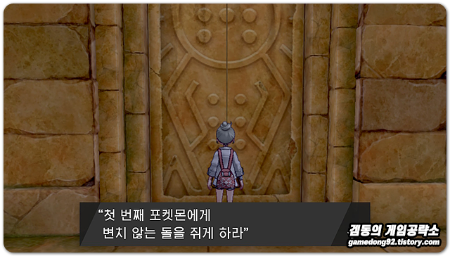 첫 번째 포켓몬이라길래 스타팅 포켓몬을 뜻하는 건가?라고 생각했는데, 그냥 엔트리 포켓몬 중 첫 번째 멤버를 뜻하는 것입니다. 첫 번째 멤버 포켓몬의 지닌 물건에 '변함없는돌'을 쥐어주고 문과 상호작용 하면 됩니다.
