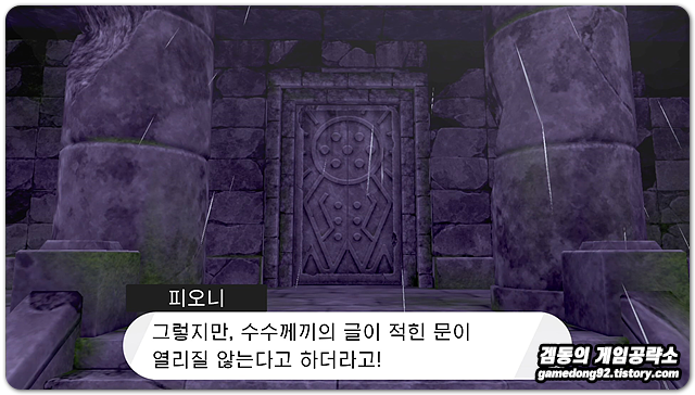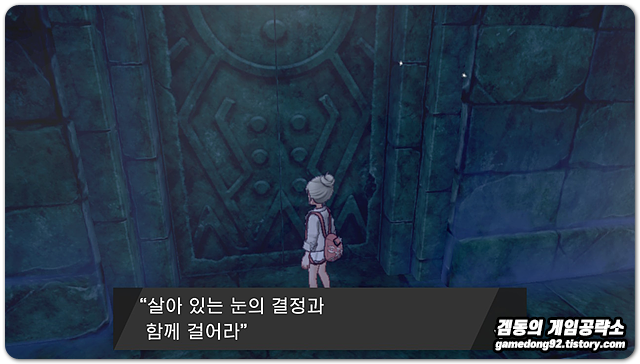 유적의 문에 다가가 A 버튼을 누르면 "강철의 거인을 깨울 정도의 소리를 내어라"라는 지시가 있는데,