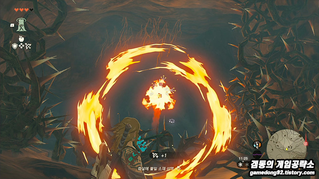 동굴 내부에는 가시덩굴이 길을 막는 경우가 있는데, 불을 이용하여 태우고 나아가면 됩니다.